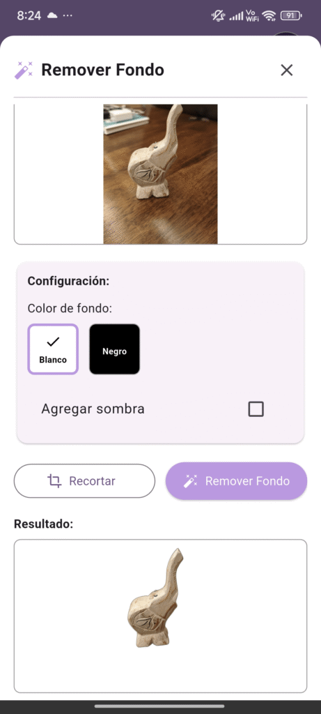 Si no tienes tus fotos listas, tómalas directamente cuando vas a crear un producto. Puedes editarla directamente en la app: gírala, recórtala, amplíala y hasta eliminar su fondo con Inteligencia Artificial.